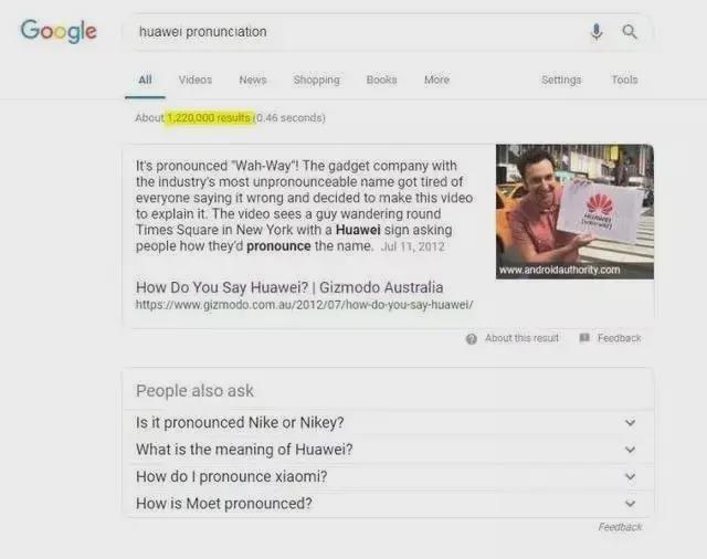 比如,在谷歌上,关于怎样"HUAWEI Pronunciation"(HUAWEI如何发音)的检索就超过122万个结果。