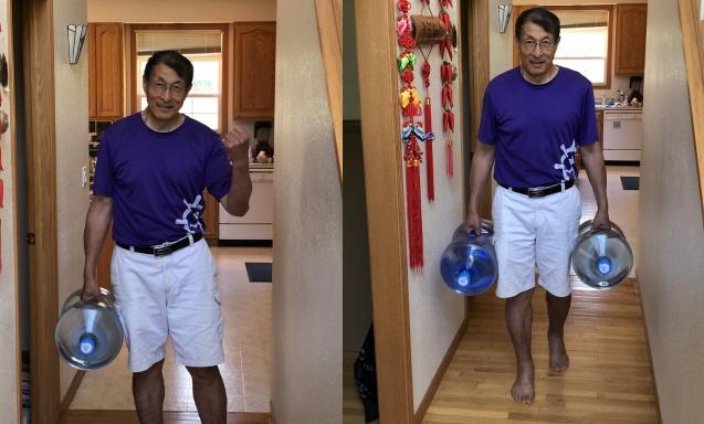 我的观察是中国男性健康里缺的最多的就是力量(抗阻)训练。力量训练其实很简单,以自己的身体为负荷,到处可练,俯卧撑、中国的马步站桩都是很好的例子。这不,家里的饮水罐(每罐水 = 5加仑 x 3.79公斤 = 18.93公斤)成了我新的搬重练习(Load Carrying)的“哑铃”!