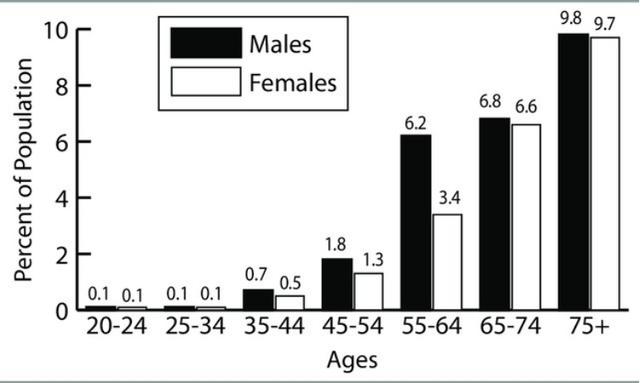 上图是2002年美国男性(黑色)和女性(白色)各个年龄组(横轴)患心衰的百分比(纵轴)