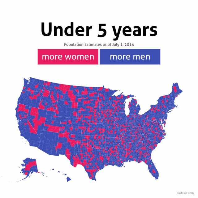 以下图示是美国在2014年各县(County;注:美国的行政体系是联邦、州、县、市)男女比例的统计对比,如果男人比女人多,该县就呈蓝色;反之,则呈红色。
