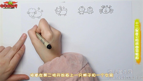 1、我们首先在左上角画出白羊座的一只小白羊,往右绘出金牛座的一头牛,继续画出双子座的双子和巨蟹座的螃蟹。