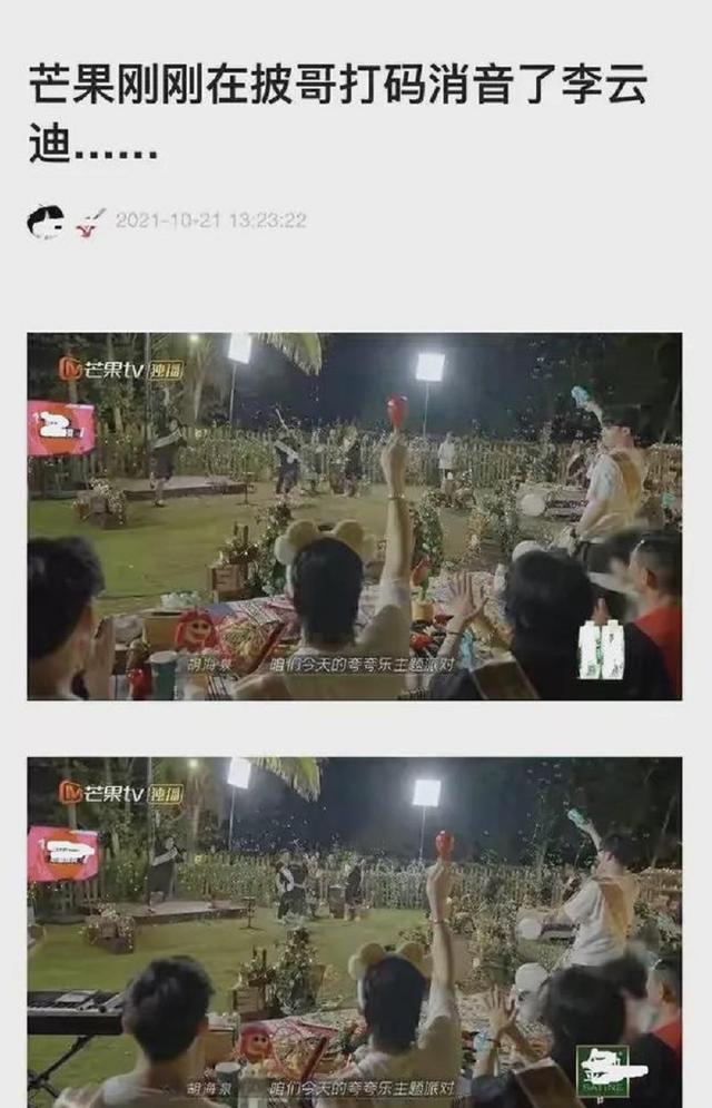 接着很快有网友表示不但打码,李云迪还被消音了,并且非常明显,刘涛介绍复活队员的时候仅有陈辉,李承铉介绍队员的时候,他那一队一直没有李云迪的名字,也没有李云迪的单人镜头。