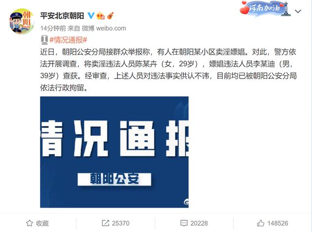 通报中写道:“近日,朝阳公安分局接群众举报称,有人在朝阳某小区卖淫嫖娼。对此,警方依法展开调查,将卖淫违法人员陈某卉(女,29岁),嫖娼违法人员李某迪(男,39岁)查获。经审查,上述人员对违法事实供认不讳,目前已被朝阳公安分局依法行政拘留。”