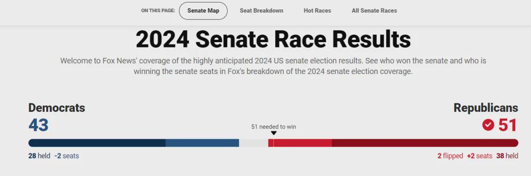 在参议院选举中,共和党已经至少赢得51席,取得了参议院控制权,成为多数党。