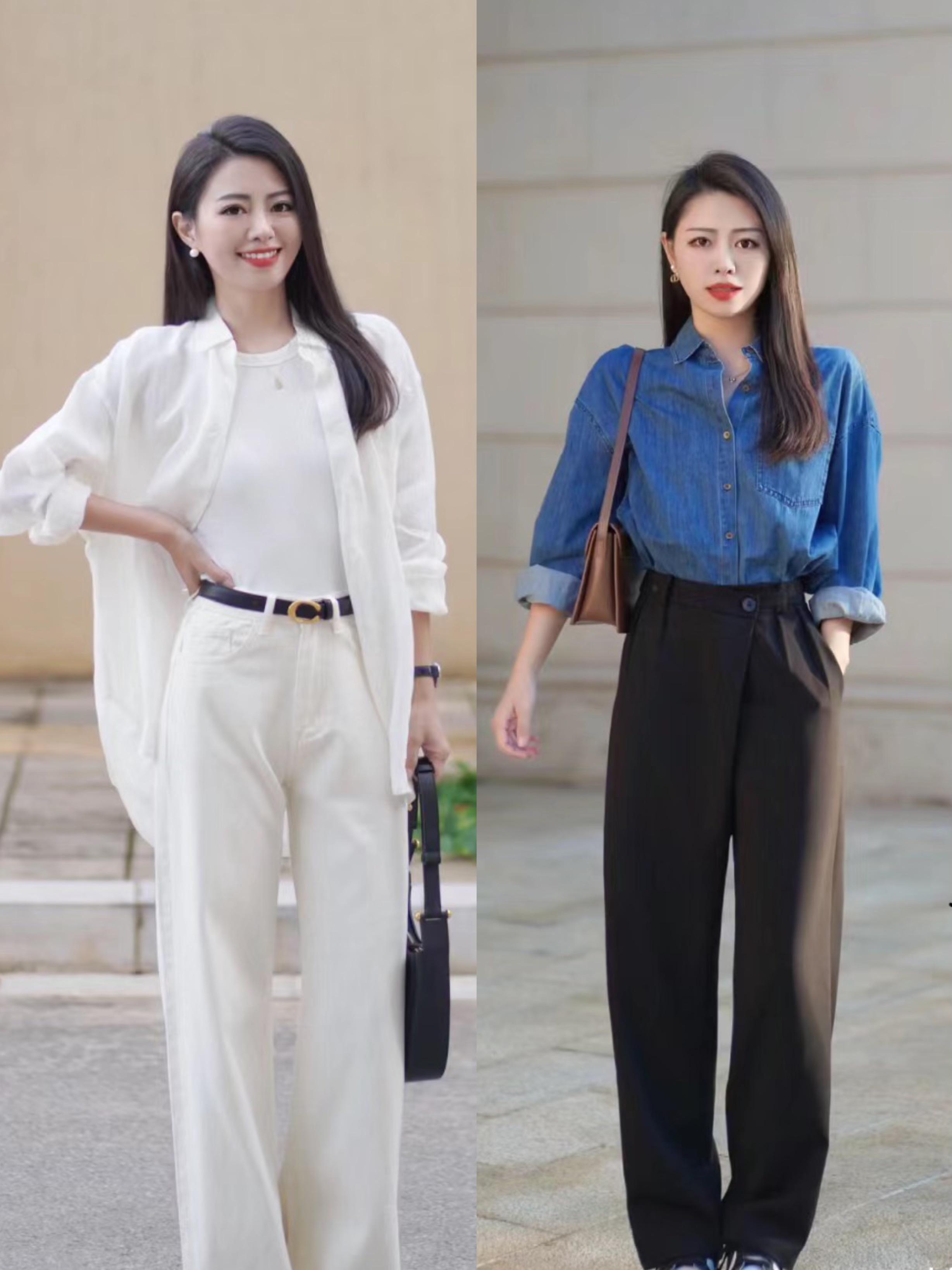牛仔衬衫是一种比较帅气利落的单品,高腰的直筒裤对于下半身的包容性也特别好,可以表现出一种高挑挺拔的美。