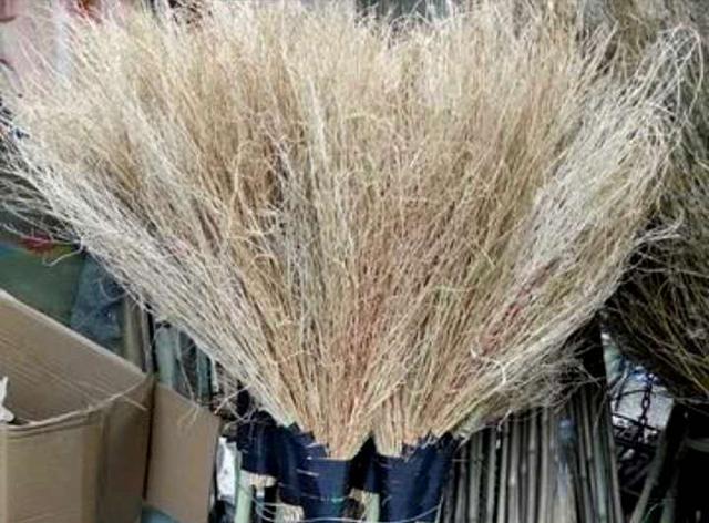 到了9月初,铁扫把的植株开始老化停止生长的时候,用刀从底部把植株砍断后,扎成捆担回家,然后摆放在屋檐下等它脱水后,就可以把大枝的做成大扫把,小枝的做成小扫把了。