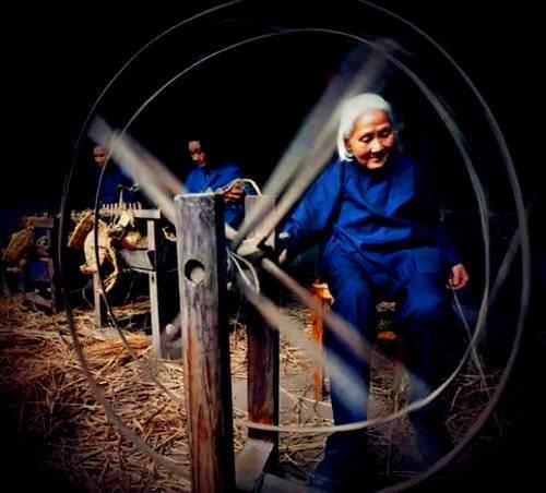 一团棉花捏出一条来,边搓边拉成线团,放到纺车上摇起来,然后就变成了一条条不断的棉线,缠到线筒子上,就可以送到下一步工序织布了。