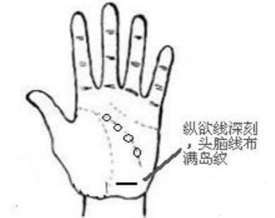 5、纵欲线的纹路极为深刻,同时头脑线细微且浅而不显,其上并布满岛纹,且向着太阴丘垂下