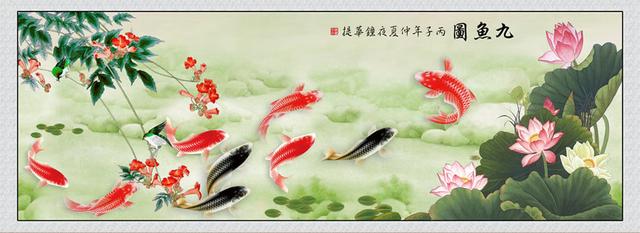 九鱼图顾名思义,是指画有九条鱼的风水画,鱼容易让人联系到“余”,有年年有余的吉祥寓意。另外,“九”不单单是一个数字,它还是我们中华民族中的传统吉祥数字之一,有长长久久的美好寓意。比如我们的重阳节,因为是在农历的九月九日,也是寓意老人家的高寿,有吉祥的寓意。另外,鱼在五行中是属水系,五行缺水的人家中最适宜挂九鱼图。