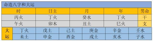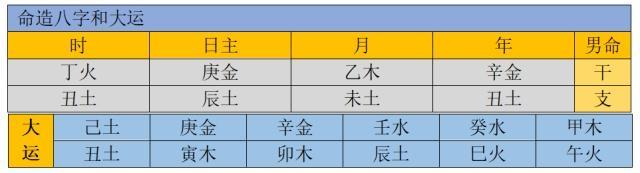 也许有人问,支全四土,是不是土重金埋?非也,因有辛金,乙木透出,不见有土透出,所以不算土重金埋,只是土多金旺,日主属强,喜丁火,乙木透出为用,忌土、金、水。