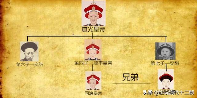 上面已经说了,同治皇帝没有子嗣,咸丰皇帝又只有同治皇帝一个儿子,所以距离皇位最近的近支皇亲就只能从咸丰皇帝的父亲——道光皇帝孙子辈里面选择。道光皇帝生有九子,其中两子早夭;皇五子奕琮过继给了别人已不算道光皇帝一脉;皇长子、皇八子、皇九子均无子嗣,不用考虑;最后便只剩下皇六子奕訢和皇七子奕譞了。