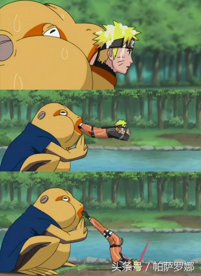 这一招其实是蛤蟆吉想出来的,让鸣人到蛤蟆龙的嘴里,之后两者利用查克拉达到心灵相通,借助蛤蟆龙的喷射力,一口气将鸣人弹射到敌人面前,再加上鸣人的螺旋丸,对让敌人毫无防备之力,然而想法与现实往往差很多,蛤蟆口组合忍术最终受伤的还是鸣人,频频以头撞地,没有一点攻击力。