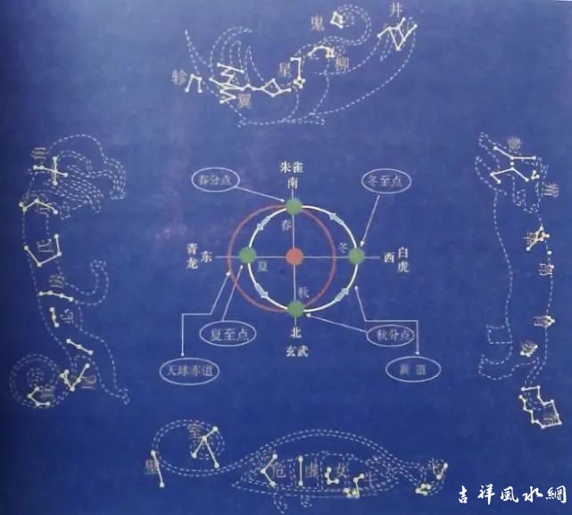 在传统文化中,人们将天上的星辰分成了东、西、南、北四个区域,称之为“四象”。将天上黄道附近的二十八组星宿,称之为二十八宿。二十八宿分别居于四象之位,东方七宿谓之“青龙”,西方七宿谓之“白虎”,北方七宿谓之“玄武”,南方七宿谓之“朱雀”。