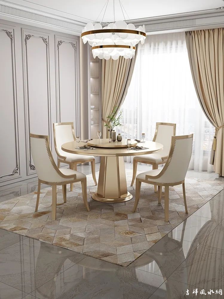 有些人喜欢豪华气派,专门选购特大餐桌,这本无可厚非,但必须注意餐桌与餐厅的大小比例,如果餐厅面积并不宽敞,却摆放大形餐桌,形成厅小台大,非但出入不便,而且会阻碍餐厅的风水。