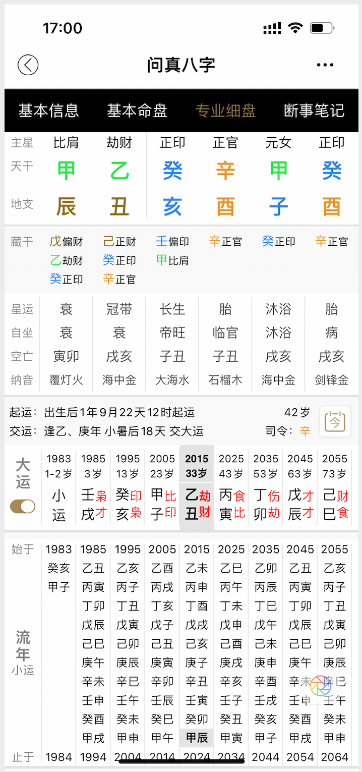 综合分析:原局成格,但官印多而旺,所以虽成格,有格局的架子,但没有大富大贵,甚至达不到中富中贵。大运宜行火运泄身,土运裁印皆是好运,所以日主晚运不错。