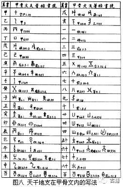 商以干支纪日,以十干为名,所以干支字很多。对于数字已知一到十、百、千、万;天象方面已知日月食、置闰以及云、虹、风、雨等等。总之,卜辞的内容相当丰富,也有规律可循,而进行科学的分类,既方便初学,又便于研究,所以十分重要。”(图八是甲骨文的干支写法)