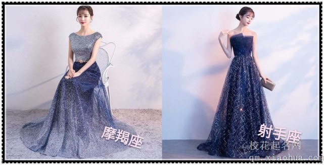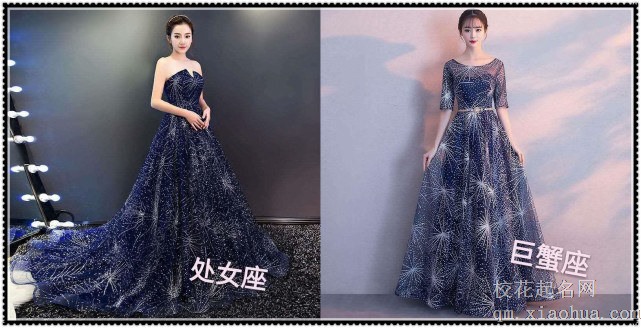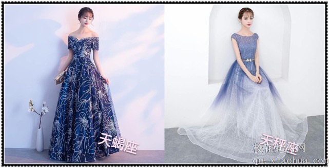 先看双鱼座的,墨蓝色的纱质长裙上面全是一闪一闪的星星,就像是真的星空一样,好美呀;而水瓶座的是银白色的露肩长裙,裙子上面全都是用亮线缝上去的枝叶,也是很美丽呀,这两件衣服都很显气质。