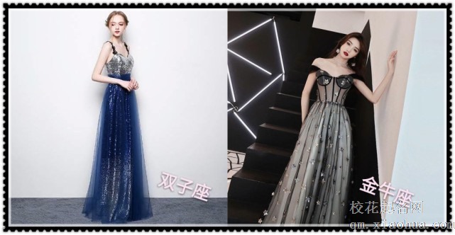 双子座的,长款吊带裙,同样是银闪闪的,上半身为银色,下半身是墨蓝色,远看就像是一条美人鱼;再看金牛座的,黑色的,里面是白色的,最外面一层黑纱,黑纱上有很多闪闪的小星星,也超美。