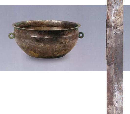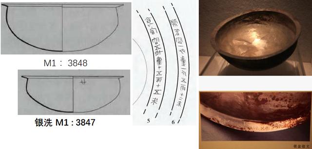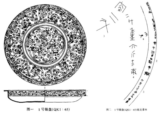 银盘口沿的下部底面,刻有铭文“奇千三百廿二斩六斤十三两二斗名东”。大意解释为此盘值一千三百二十二斩,重六斤十三两,容两斗。“名东”意为东宫用品,“斩布”为三晋的钱币名称,由此推断这段铭文应为战国时期由三晋诸国(韩、赵、魏三国之一)所刻。这是1号银盘四款铭文中最早的题刻,据此推断三件银盘可能是在三晋时期韩赵魏中的一个国铸造。