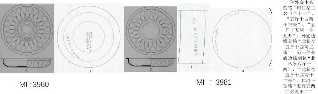 Ml : 3981, 内底素面。外底边缘刻有铭文“北私今六斤 十两”、“北私今五斤十四两十二朱”,口 沿下刻有铭文“五斤五两口朱名田口” 。