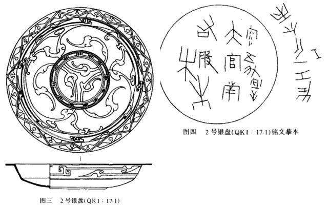 2号银盘(QK1 : 17-1),外腹刻“左工一斤六两Ⅰ”,外底刻,'容五升大官南右般朱”。实测重340克,每斤合247克;水容900毫升,每升合180毫升。