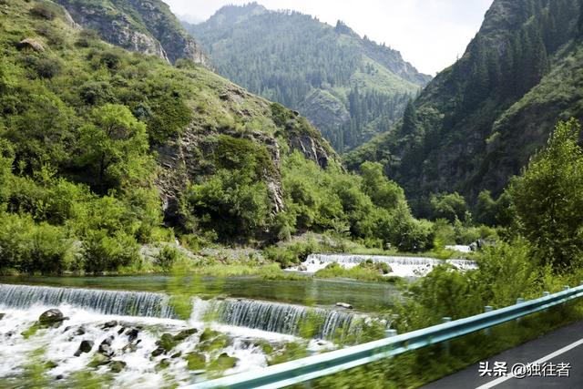 我们驱车来到天池风景区,游天池需乘坐景区的交通车前往,上山时山路蜿蜒曲折,坡陡弯急,伴随一条来自天池的水形成的奔腾溪流,清澈的溪水冲击着溪边的岩石,激起雪白的浪花,使在吐鲁番的那种灼热气息一扫而空,一股清新凉爽的气息迎面而来。
