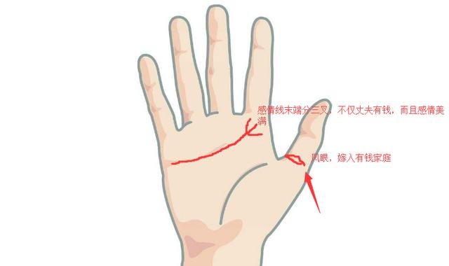 2,感情线末端分三叉,以及拇指有凤眼。