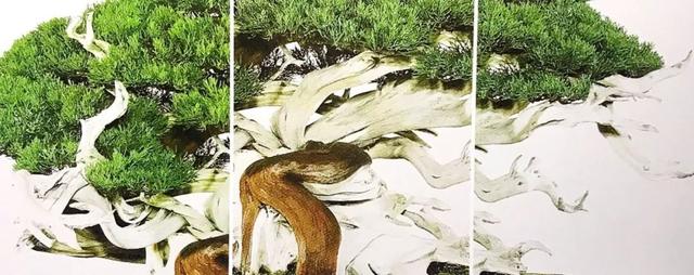 真柏的习性就比较柔软,线条弯曲变化丰富,其舍利干与水线交织缠绕表现出生命的壮丽,在创作表现时要充分地利用这种特性来表现线条曲线美。