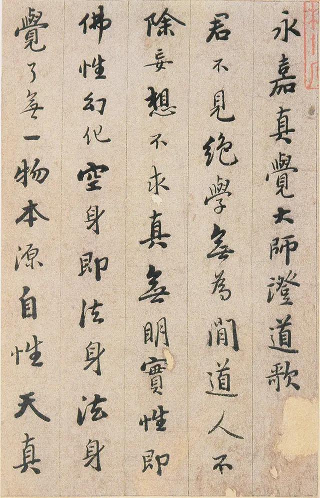 《永嘉真觉大师证道歌》内容为性理修养之说,涉佛教。写法上本于王字,不少字的结字与《圣教》相类。然取势用笔颇有自己特色,与明末书家喜一笔顺势带下,连绵不断的行草写法迥然有别。此本总体的特点是静穆而不乏灵动,端稳而不乏妍美。取行楷法,字字独立以倚侧引势,以大小错落取得变化,以粗细轻重显现节奏。舒展处尽展其势,内敛处不乏其韵。全篇章法总有若干重字以醒目,若干轻字显灵动,通篇取左低右高侧势,款款书来极为自然,一如一股清泉从山间缓缓而下,绝少火气和鼓噪之气,读来如行云流水一般,既有古意又有时趣,古意者取大王儒雅的神韵,时趣者,用小王内擫笔法圆转引带,以消泯火气,不过分追求转折顿挫的变化,因而显得妩媚,当然个别笔画也会显得不很硬朗而有些飘浮。从其取法的角度看,憨山悟性极高,有聪慧之气,所以他的作品前人的影子不多,自己的个性不少,有时还善于在个别点画中以隶意出之,这在妍美的风格上掺和进了一点古拙的意味。